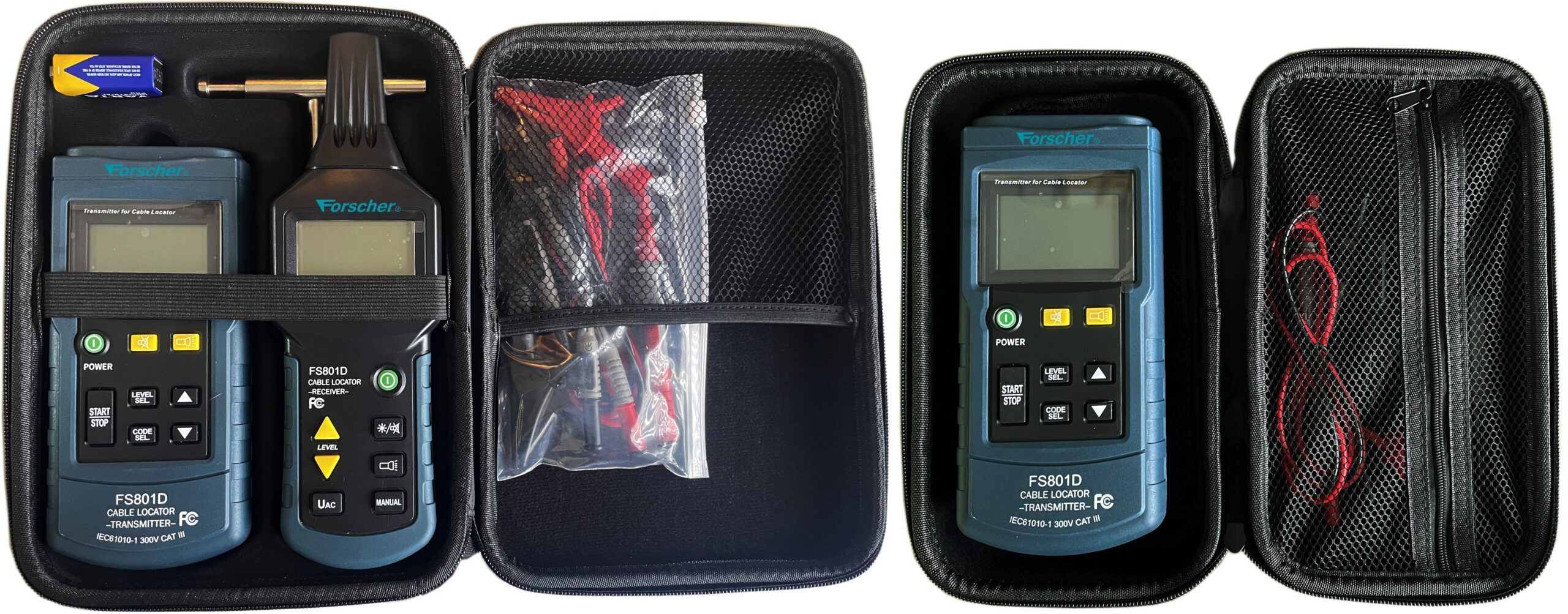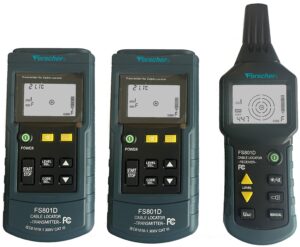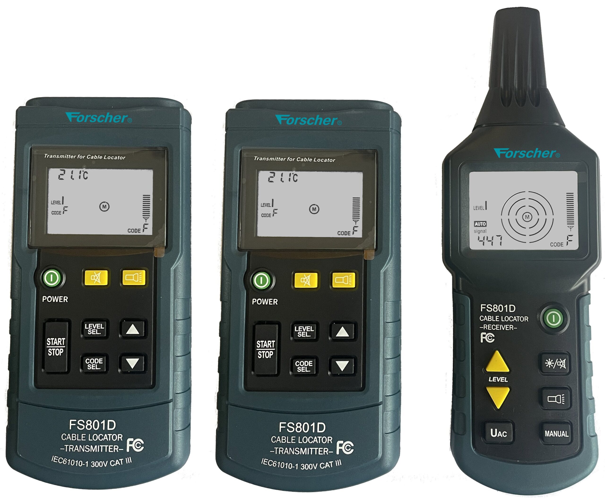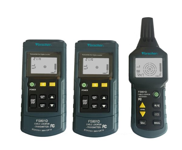 Przemysłowy detektor szukacz kabli i rur . Konstrukcja oparta na unikalnej technologii łączącej w sobie generowanie zarówno tonów analogowych jak i cyfrowych wykorzystywanej przez amerykańską firmę FLUKE pozwalającej na uzyskiwanie dużej dokładności w lokalizowaniu kabli i rur w ziemi w ścianach , podłogach itp . Duża moc – głębokość wyszukiwania do 2,5 m. pod powierzchnią. Detektor przewodów FS801D może pracować pod napięciem elektrycznym do 400 VAC.